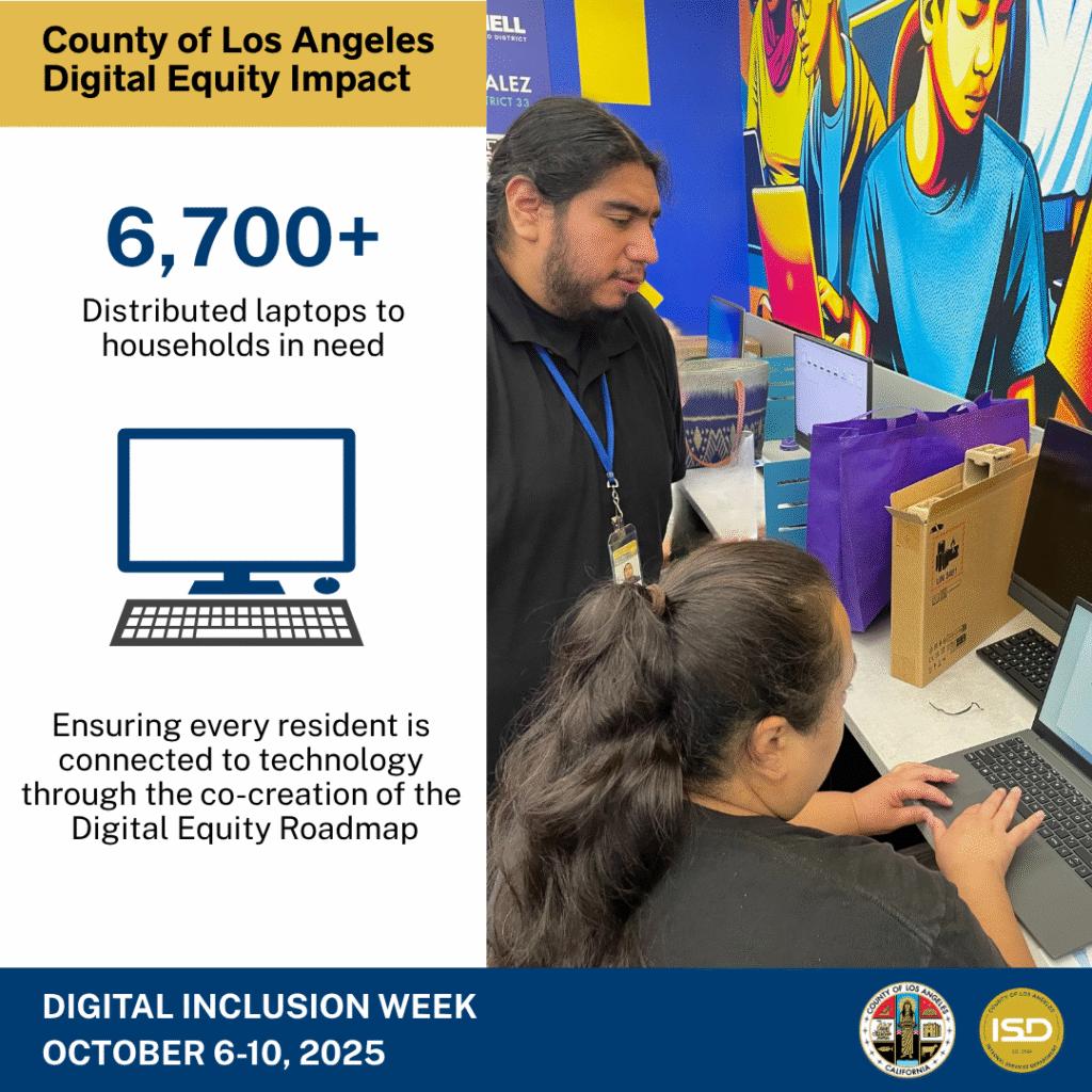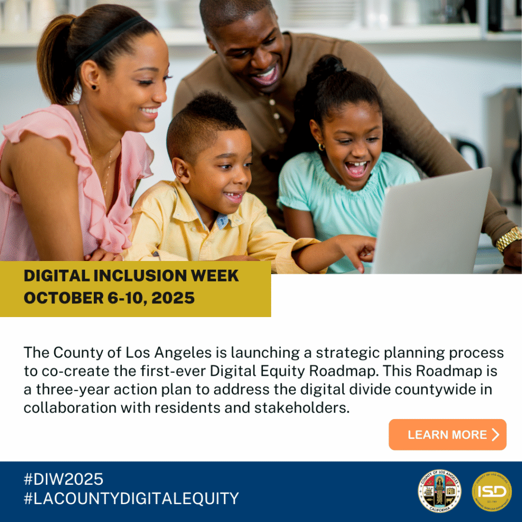 The County of Los Angeles officially recognizes Digital Inclusion Week countywide, from Monday, October 6, to Friday, October 10, with a Board of Supervisors proclamation. National Digital Inclusion Week is an annual week of awareness, celebration, and recognition where digital inclusion leaders and practitioners across the nation showcase their digital equity activities. This action serves as the kickoff for a new countywide initiative: the co-creation of the first-ever County Digital Equity Roadmap. This Roadmap is a three-year action plan to address the digital divide countywide. This includes ensuring that every resident of Los Angeles County has access to the internet, technology, digital skills, and support.