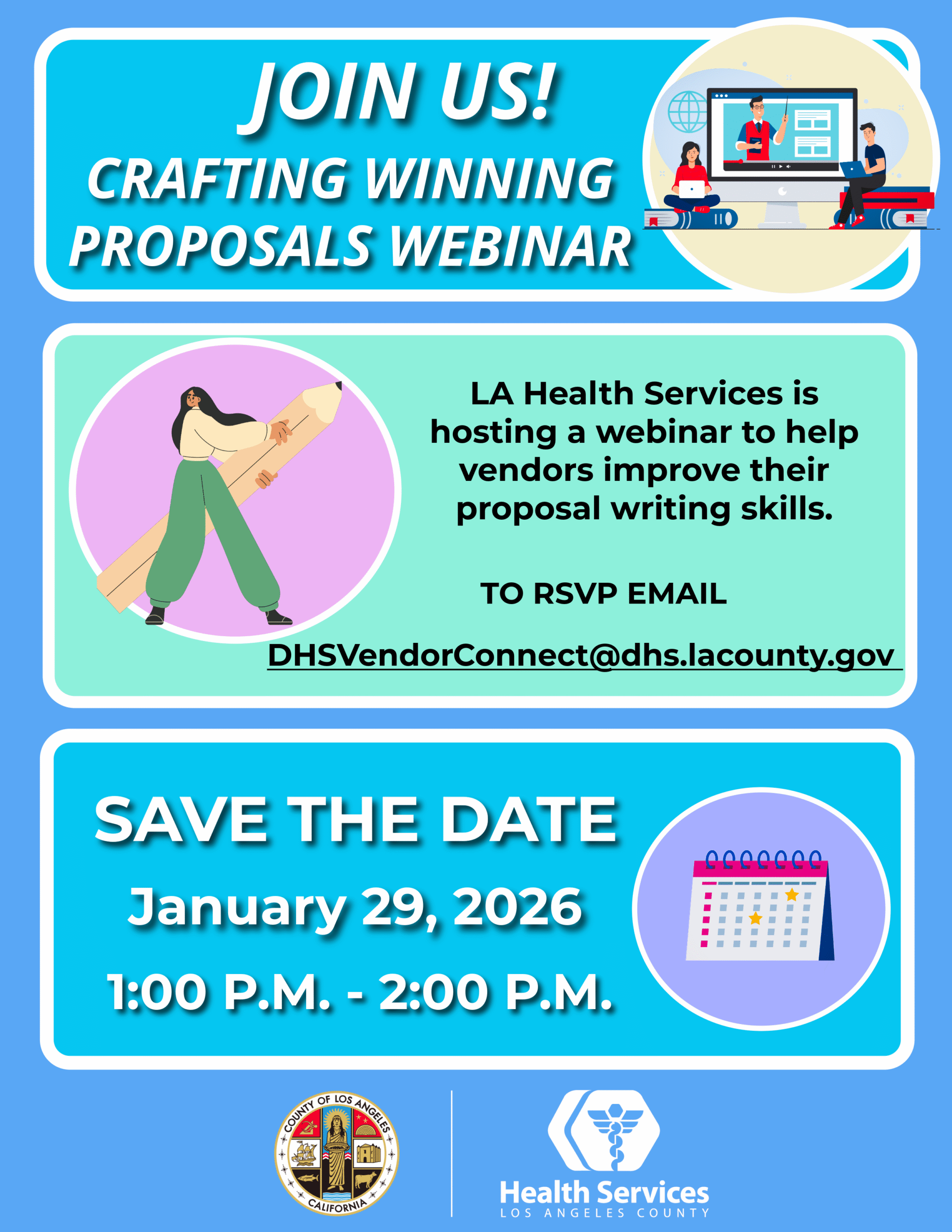 Los Angeles County Health Services invites you to our upcoming Microsoft Teams webinar: Crafting Winning Proposals Date: Thursday, January 29, 2026 Time: 1:00 PM – 2:00 PM (PST) To RSVP, email: DHSVendorConnect@dhs.lacounty.gov This one-hour session is designed to help vendors strengthen their proposal writing skills and better position themselves for contracting opportunities with LA County […]
